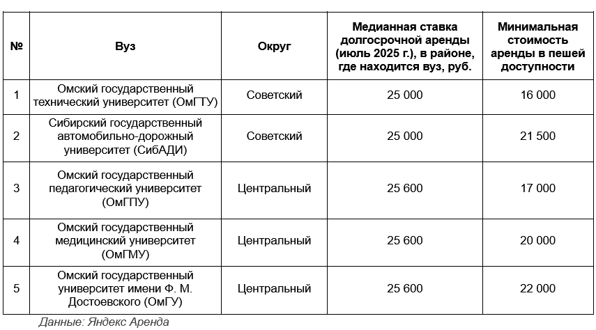 Накануне начала учебного года специалисты проанализировали стоимость долгосрочной аренды рядом с ведущими вузами Омска. Большинство из них расположены в Нефтяниках, где в целом по округу средняя медианная ставка аренды составляет 25 тыс. рублей.