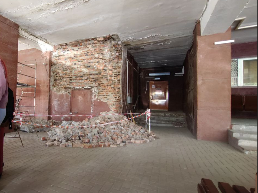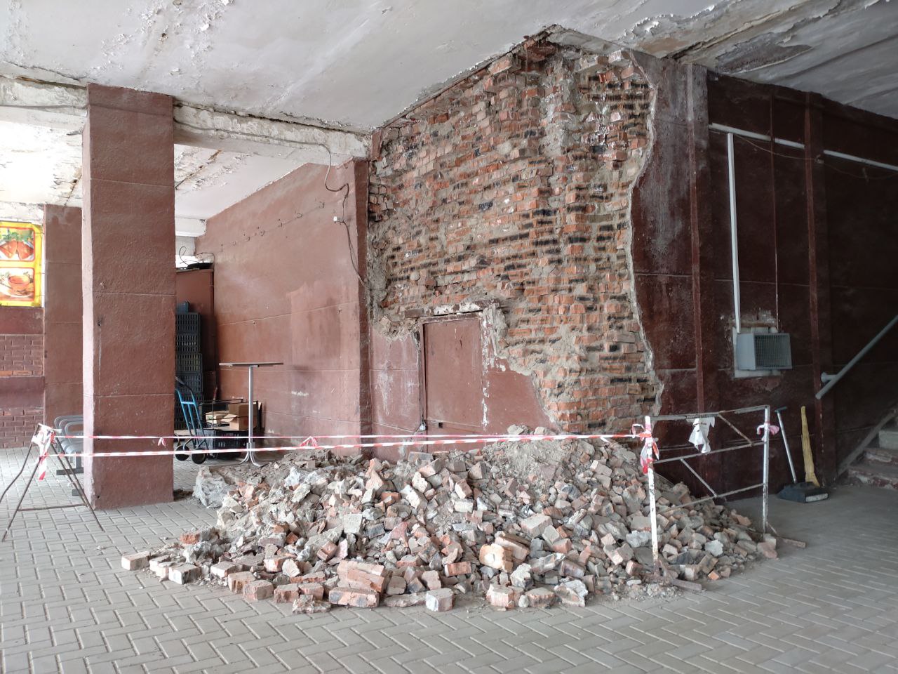Таким образом обрушения кирпичной кладки не происходило. На период проведения конкурсной процедуры отбора подрядчика для ремонта стены данного объекта место проведения демонтажных работ было огорожено сигнальной лентой.