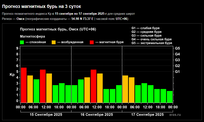 Жителей Омской области во вторник, 16 сентября, ожидает слабая магнитная буря (уровень G1). Возмущения в магнитосфере начнут проявляться с раннего утра - с 6:00. Пик геомагнитного возмущения придется на полдень.