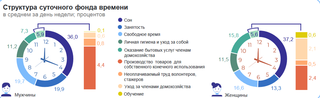 У женщин ежедневно остается гораздо меньше свободного времени в том числе потому что они в тратят в два раза больше мужчин часов в сутки на «оказание бытовых услуг» членам своей семьи. Также преимущественно на их плечах лежит уход за детьми и другими родственниками. При этом у мужчин уходит в два раза больше суточного времени на «производство товаров для собственного конечного использования».