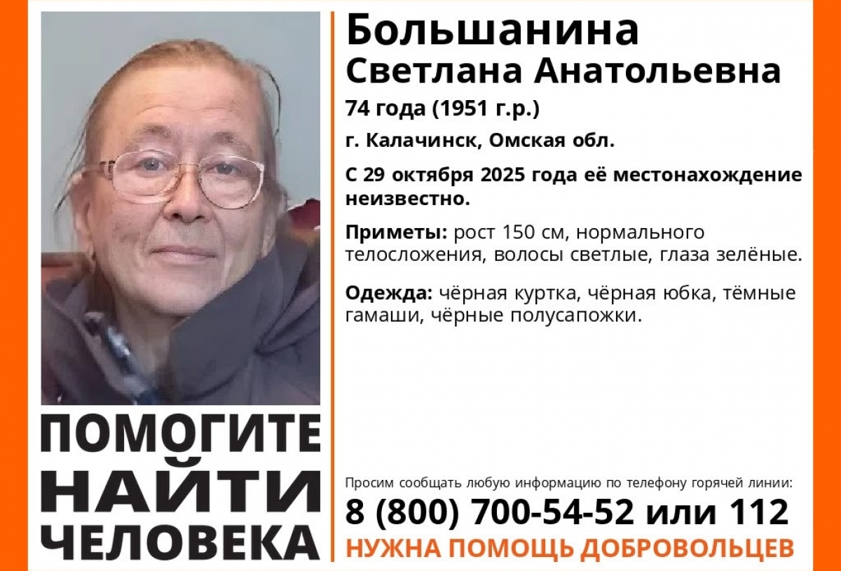 Поисковый отряд «Лиза Алерт» сообщил о розыске 74-летней Светланы Большаниной из Калачинска. Женщина пропала 29 октября, с тех пор ее местонахождение неизвестно.