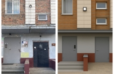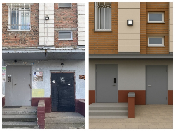 Двери и фасады двухэтажек 53-го года и построенной в начале 90-ых пятиэтажки напрочь убиты временем, обрывками объявлений и закрашенными кусками наскальной живописи. Ступеньки у входа в пятиэтажку выглядят как неудачная карьерная лестница.