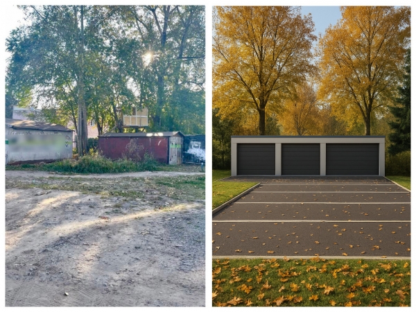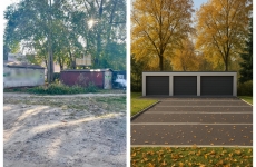Что мы сделали: убрали от подъездов все инструменты из арсенала крестьян, обновили фасады домов и двери. Где требуется — уложили плитку или постелили газон. Обновили инвентарь на спортплощадке и зонировали ее живой изгородью, так как в реальности она отгорожена от хаотичной парковки все теми же шинами. Попытались сделать цивилизованную парковку, сохранив, но модернизировав при этом гаражи. Правда, ИИ по своей традиции даже с пятой попытки не смог организовать нормальный заезд сюда. Учитывая то, что вполне реальные люди — мои соседи по дому — за много лет тоже этого не смогли, предлагаю относиться к этому нюансу снисходительно.