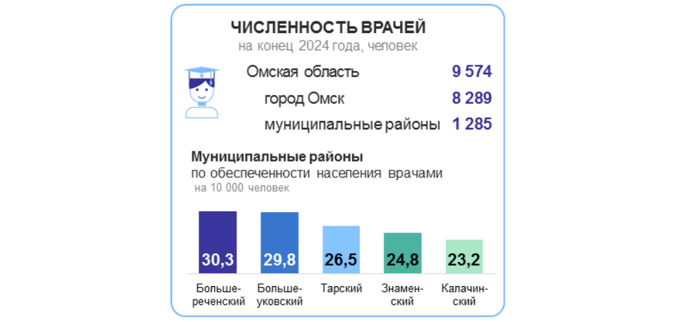 Есть в приведенных данных и информация об обеспеченности сельских территорий врачами. На конец 2024 года в Омской области работало чуть более 9,5 тыс. специалистов с высшим медицинским образованием. Преобладающее большинство из них (более 8,2 тыс. человек) трудоустроены в учреждениях Омска. В районах работает только 1,3 тыс. врачей. В большинстве сельских населенных пунктов на каждые 10 тыс. жителей приходится менее 23 врачей.