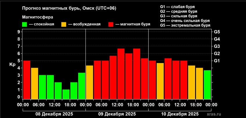 По данным лаборатории солнечной астрономии ИКИ и ИСЗФ, завтра, 9 декабря, в Омской области ожидается магнитная буря, почти достигающая уровня G3 (сильная буря). Она начнется с 3 часов ночи и закончится только к 3 часам ночи 10 декабря. Однако перерыв будет недолгим. Спустя три часа, во время которых магнитосфера останется возбужденной, вновь случится магнитная буря уровня G1 (слабая буря).