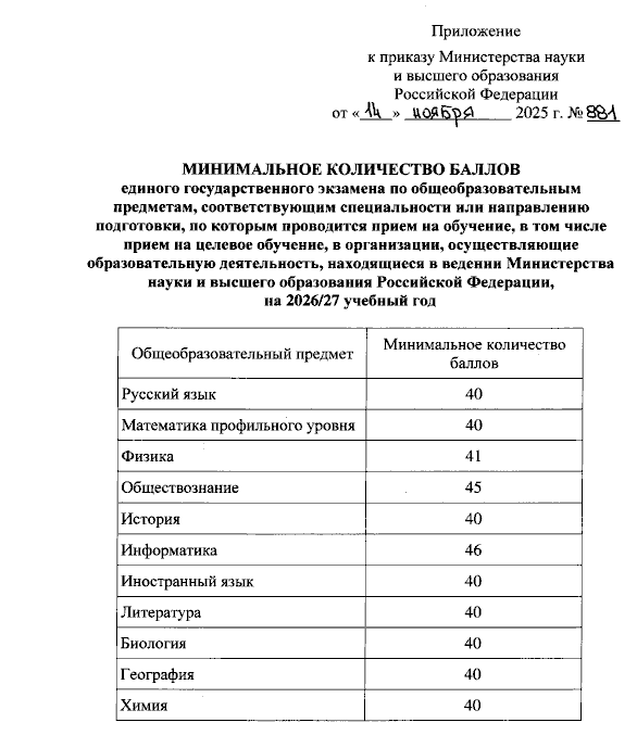 «Установить минимальное количество баллов Единого государственного экзамена по общеобразовательным предметам, соответствующим специальности или направлению подготовки, по которым проводится прием на обучение, в том числе прием на целевое обучение, в организации, осуществляющие образовательную деятельность, находящиеся в ведении министерства науки и высшего образования Российской Федерации, на 2026/27 учебный год», - говорится в документе.