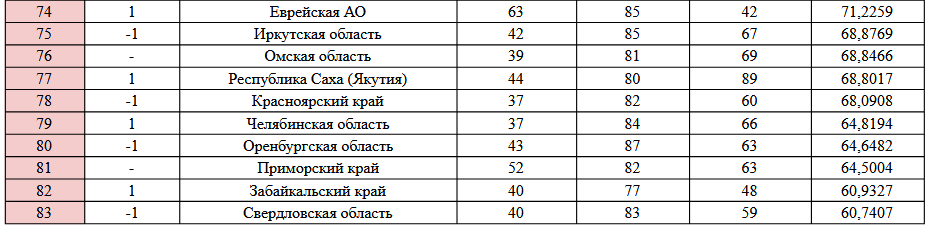 Рядом расположены другие регионы Сибири — Иркутская область на 75 месте, Красноярский край — на 78. Как следует из рейтинга, хуже всего ситуация с экологией в Свердловской области — она оказалась на последней строке.