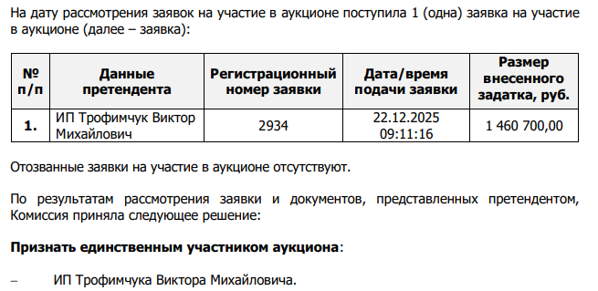 Решение комиссии гласит: «На дату рассмотрения заявок на участие в аукционе поступила 1 (одна) заявка на участие. По результатам рассмотрения заявки и документов, представленных претендентом, комиссия приняла следующее решение: Признать единственным участником аукциона: ИП Трофимчука Виктора Михайловича».