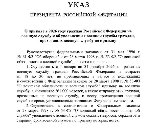 С 1 января 2026 года российские граждане будут призываться на военную службу весь календарный год. Согласно подписанному президентом Владимиру Путиным указу, размещенному на портале правовой информации, процедура призыва охватит период с 1 января по 31 декабря 2026 года. Количество россиян, подлежащих призыву, составит около 261 тысячи человек