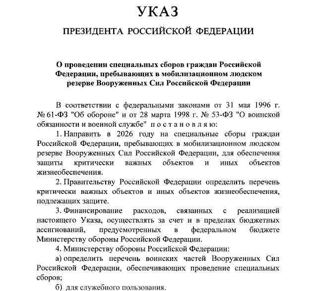 Ранее Владимир Путин подписал первый указ о круглогодичном военном призыве. За 2026 год в армию планируют призвать 261 тыс. человек.