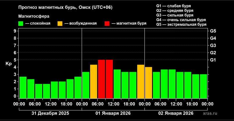 По данным лаборатории солнечной астрономии ИКИ и ИСЗФ, в четверг, 1 января, Омскую область накроет магнитная буря уровня G1 (слабая буря).