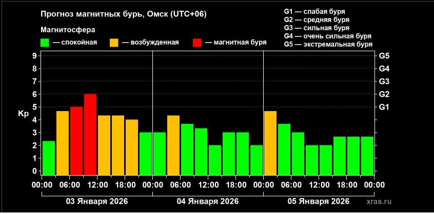 По данным лаборатории солнечной астрономии ИКИ и ИСЗФ, сегодня, 3 января, Омскую область накроет магнитная буря уровня G2 (средняя буря).