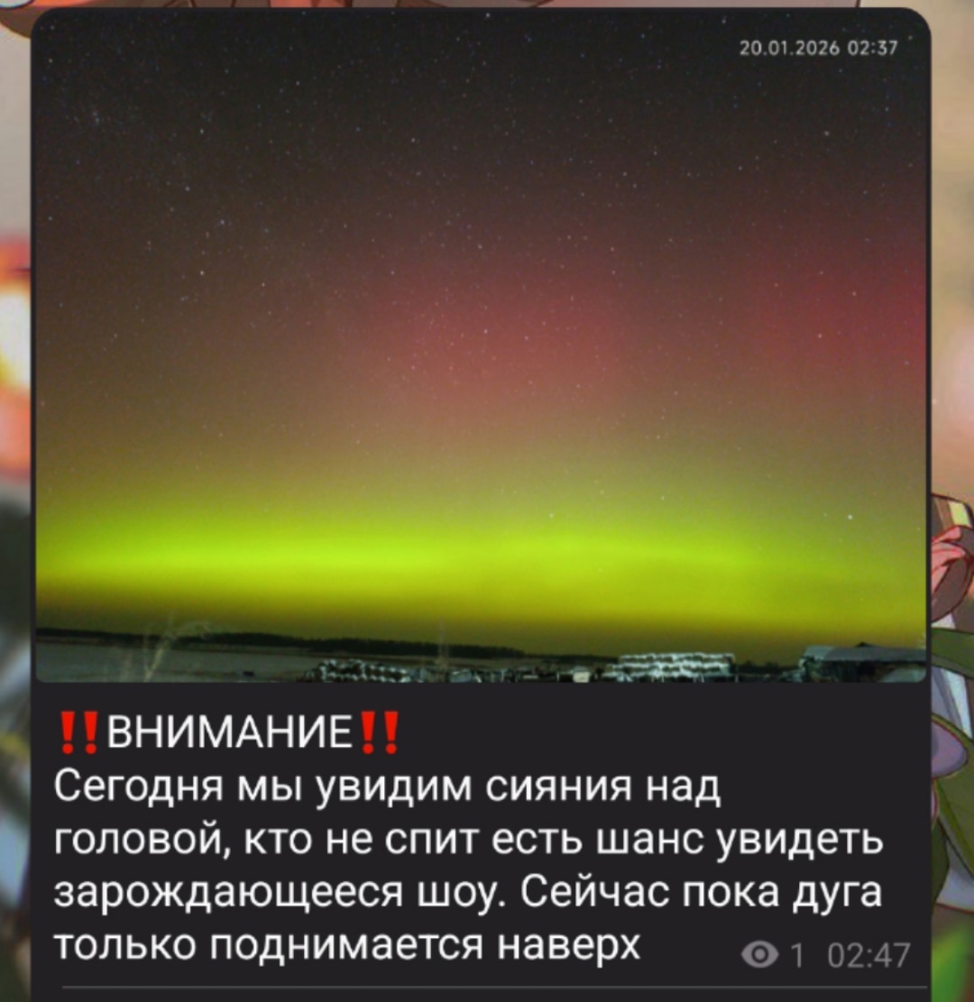 «Третий раз вижу сияние над головой. И в этот раз оно выглядело иначе. Мерцало, уходило далеко на юг, корона в зените переливалась и передвигалась из стороны в сторону. Единственный минус все происходило очень быстро. Буквально за час полтора произошла вся красота. Тогда как в прошлые разы тратила весь вечер, ночь ещё и утро чтобы понаблюдать, пофотографировать», - написала девушка в своем телеграм-канале.