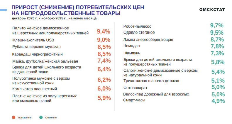 Цены на непродовольственные товары тоже выросли. Заметнее всего перед новогодними праздниками подорожали телевизоры, автомобили, смартфоны, медикаменты и одежда. Например, средняя стоимость женского пальто выросла почти на 10%, мужской рубашки — на 8,5%, платья — почти на 6%.