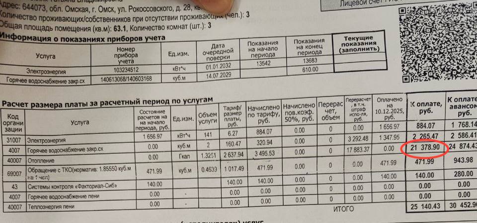 «Глаза более, чем большие на сумму по отоплению и горячей воде. Это что за перерасчет??? На 17883,48 руб - отопление и 3292,48 руб за горячую воду?? В итоге 21378.90 руб за отопление??? Это что получается? Жильцы должны заплатить за то отопление, которое вылилось на землю из-за прорыва?», - недоумевает омичка.