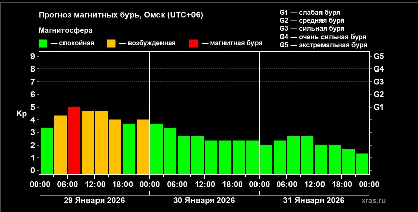 По данным лаборатории солнечной астрономии ИКИ и ИСЗФ, в четверг, 29 января, Омскую область накрыла магнитная буря уровня G1 (слабая буря).