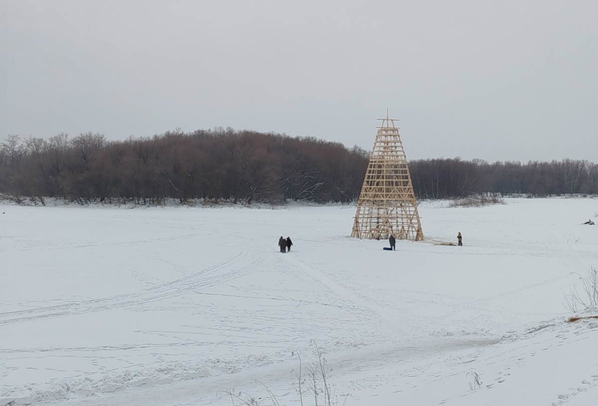 Главным героем праздника станет чучело Зимы, которое уже начали устанавливать прямо на льду Иртыша. Высота чучела составит более 15 метров: 12 метров туловища и 3 метра головы в кокошнике.