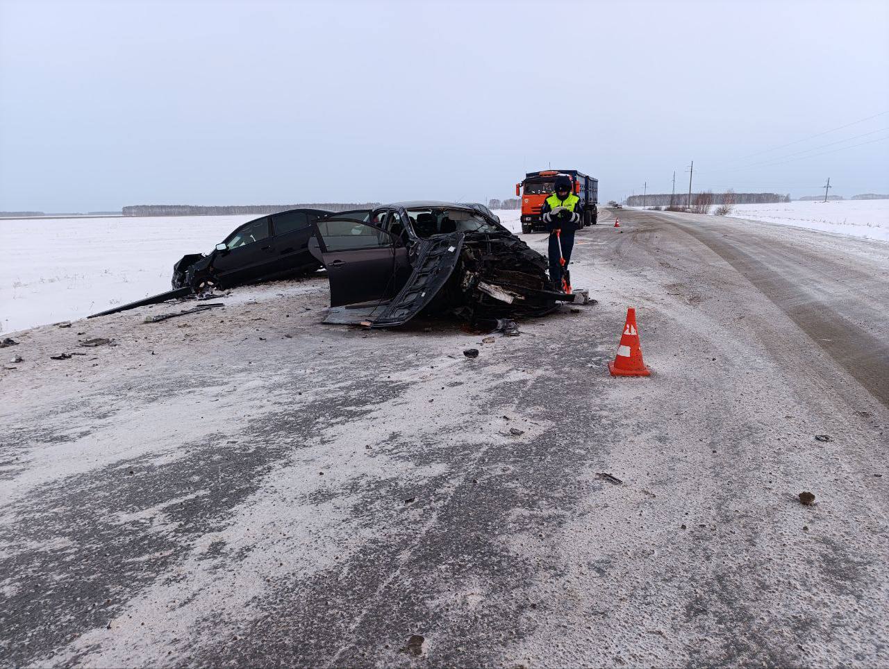 Жесткое ДТП произошло сегодня утром на дороге «Одесское-Омск». По предварительным данным, водитель автомобиля «Тойота» выехал на полосу встречного движения, где допустил столкновение с КамАЗом и «Хондой».