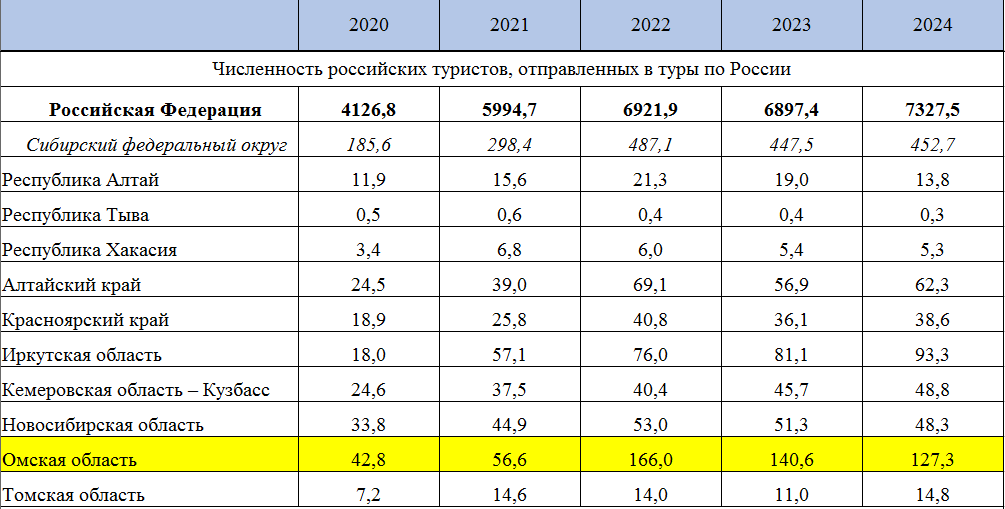 За последние три года омичи чаще остальных жителей Сибири покупали туры по России. В 2024 году турфирмы отправили в путешествия по стране 127 тыс. жителей Омской области. В других регионах покупают готовые туры реже. Так, в Иркутской области услугами турфирм воспользовались 93,3 тыс. человек, в Алтайском крае — 62,3 тыс., в Кемеровской и Новосибирской областях — по 48 тыс., в Красноярском крае — 38 тыс, в остальных — еще меньше.