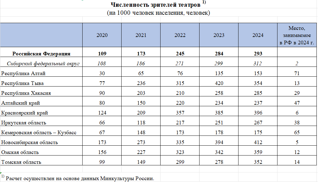 Омская область в 2024 году (отчетов за 2025 год пока нет) занимала 12 место в России по численности театральных зрителей. По этому показатели ее обошли Республика Алтай (2 место в России), Новосибирская область (5 место) и Красноярский край (6 место).