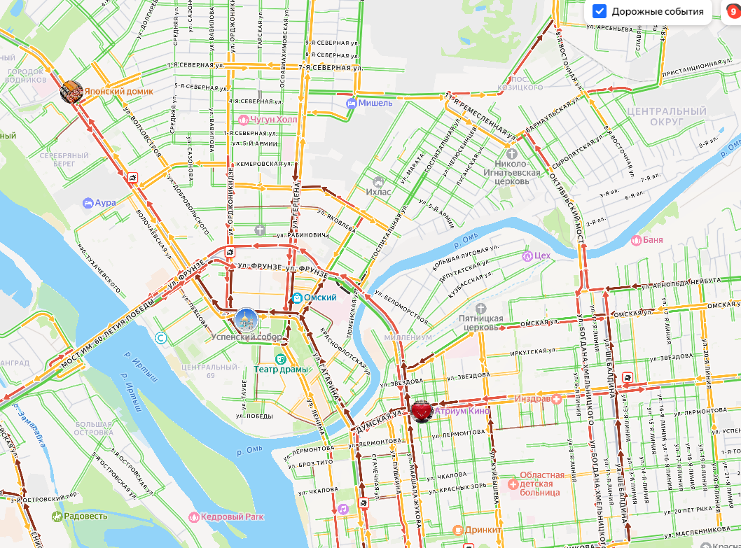 По данным сервиса «Яндекс Пробки» на 5 февраля 2026 года, уровень загруженности дорог в Омске достиг девяти баллов. Серьезные заторы практически во всех районах города.