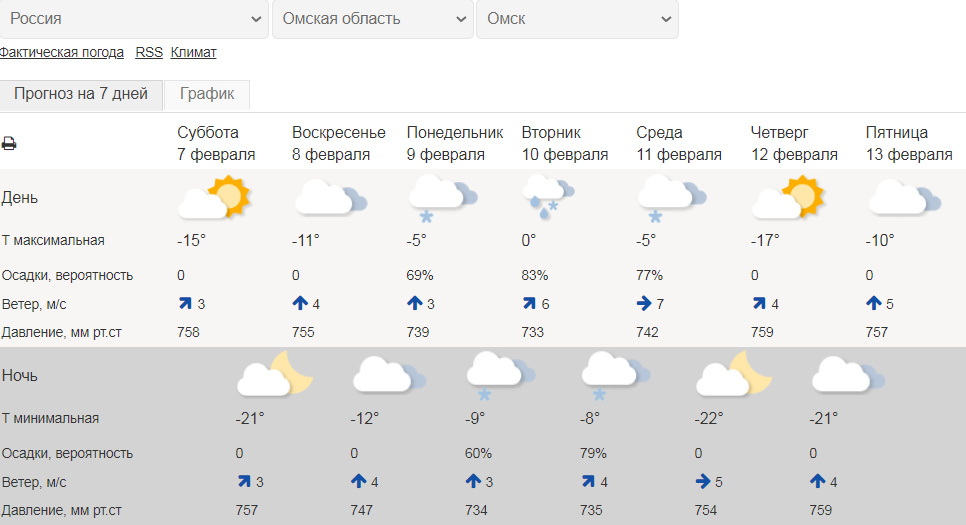 На выходных в Омской области еще сохранится морозная погода. По данным Обь-Иртышского УГМС, завтра, 8 февраля, ночью будет -20…-25°, при натекании облачности до -17°, днем -8…-13°. Будет дуть порывистый ветер до 15 м/с. Днем по северу региона пройдет небольшой, местами умеренный снег, в отдельных районах метель.