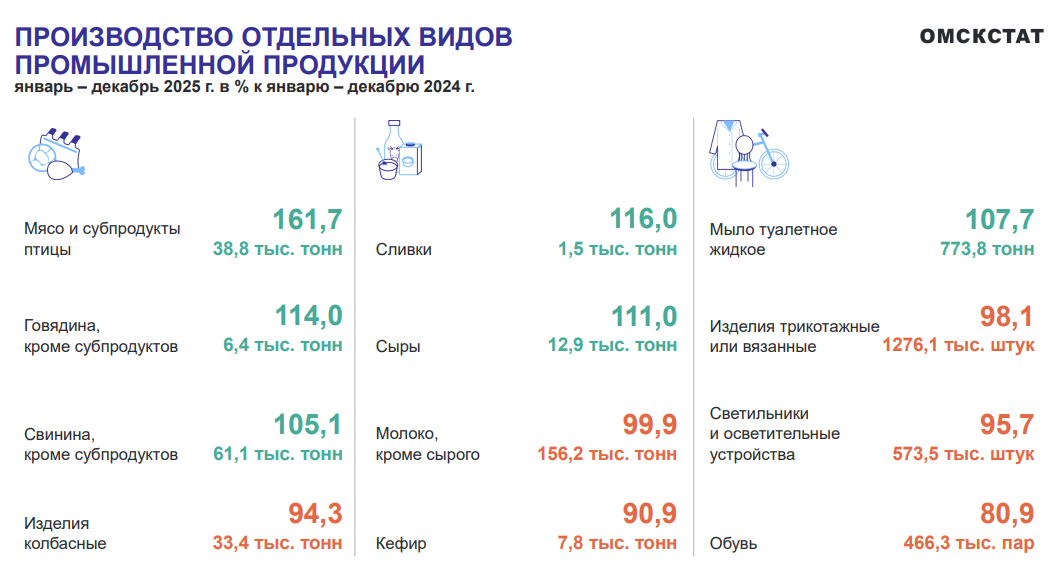 В пищевой отрасли больше, чем в 2024 году, выпустили мяса и субпродуктов птицы - на 61,7%, крупы – на 19,4%, сливок – на 16%, говядины – на 14%, макаронных изделий – на 5,5%, свинины – на 5,1%, масла растительного – на 2,9%. Снизилось производство рыбы (на 15,5%), кисломолочных продуктов (на 13,6%), кондитерских изделий (на 6,2%), колбас (на 5,7%).