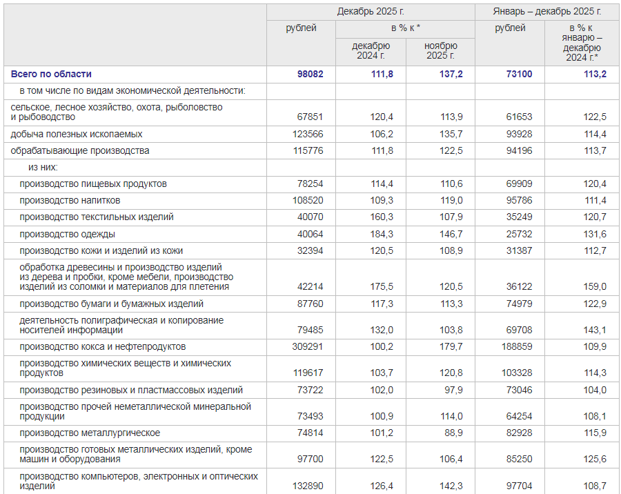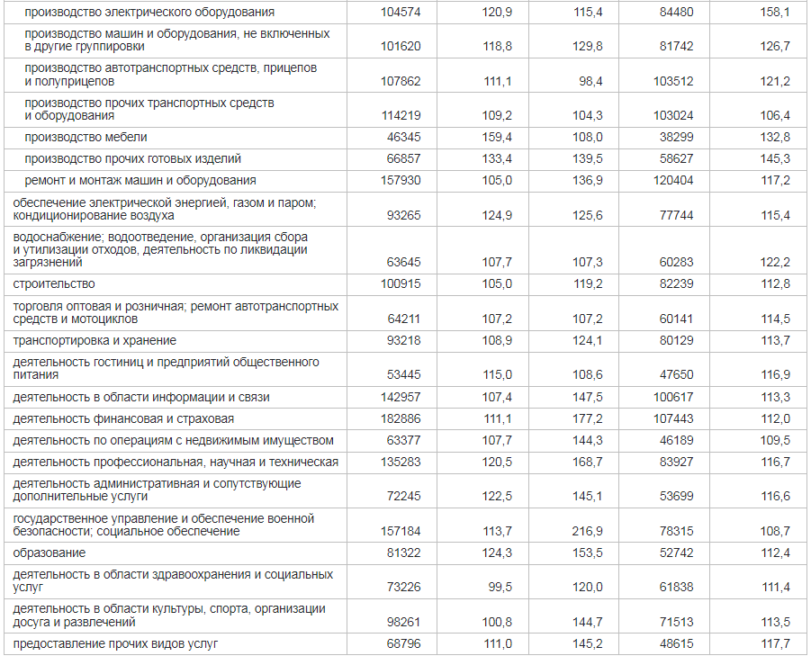 В декабре самые высоки зарплаты были в следующих сферах: производство кокса и нефтепродуктов — 309,3 тыс. рублей, финансовая и страховая деятельность — 182,8 тыс. рублей, ремонт и монтаж машин и оборудования — 157,9 тыс. рублей, государственное управление и обеспечение военной безопасности; социальное обеспечение — 157,2 тыс. рублей, деятельность в области информации и связи — 142,9. тыс. рублей.
