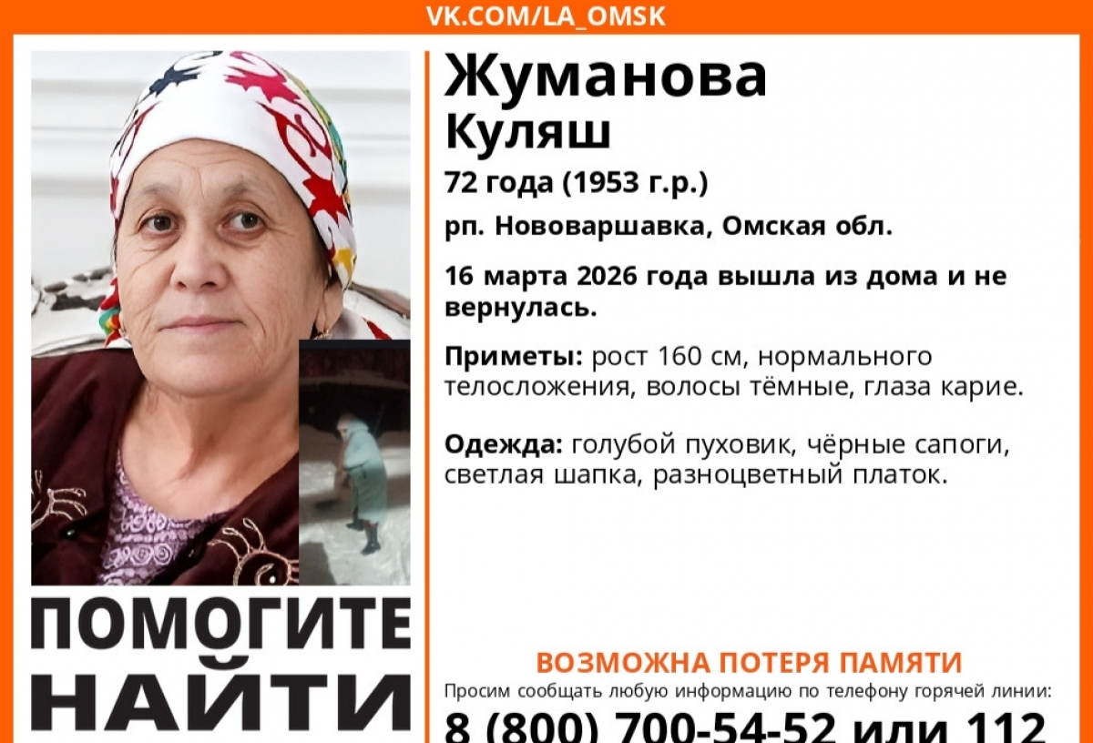 Волонтеры поискового отряда «Лиза Алерт» сообщают о розыске 72-летней Куляш Жумановой. Женщина 16 марта вышла из дома в Нововаршавке и не вернулась.