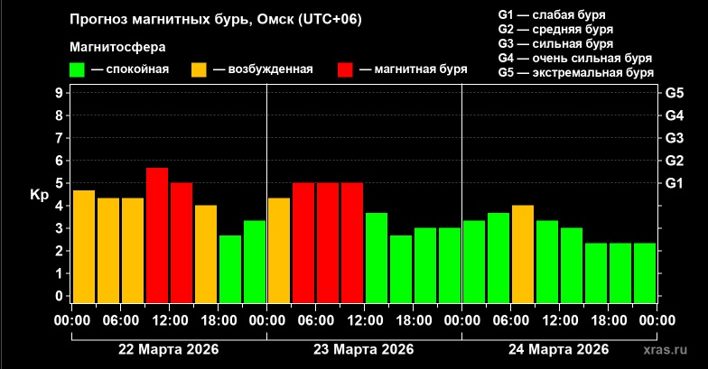 В воскресенье, 22 марта, буря началась в 9 утра и продоится до 15 часов. Следующая магнитная буря накроет Омск и область в понедельник, 23 марта, с 3 часов ночи до 15 часов дня. Уровень бурь будет колебаться от слабой до средней.