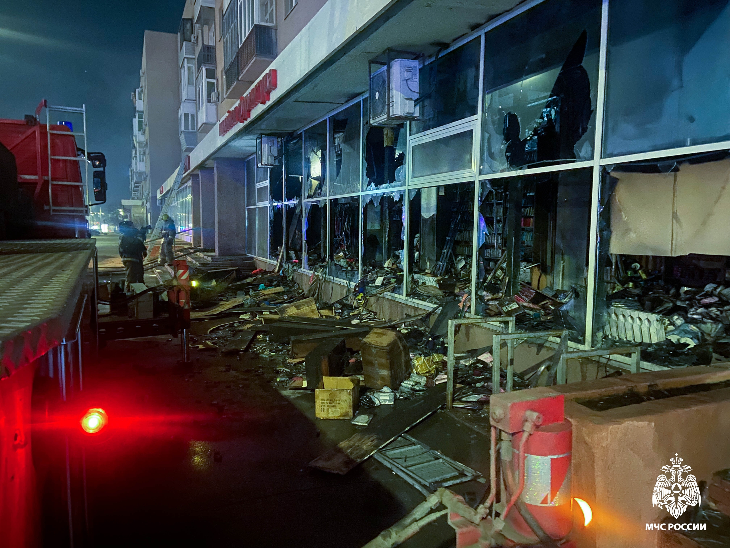 Площадь пожара составила 350 «квадратов». В магазине выбиты стекла витрины, выгорела внутренняя отделка и находившийся в магазине товар. Дознаватели устанавливают причину пожара.