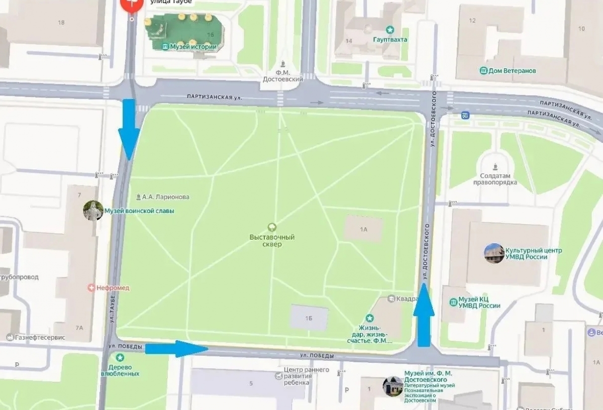 В омском департаменте транспорта сообщили о новой схеме движения транспорта вокруг Выставочного сквера. Улицы Таубе, Победы и Достоевского станут односторонними, и проезд будет против часовой стрелки.