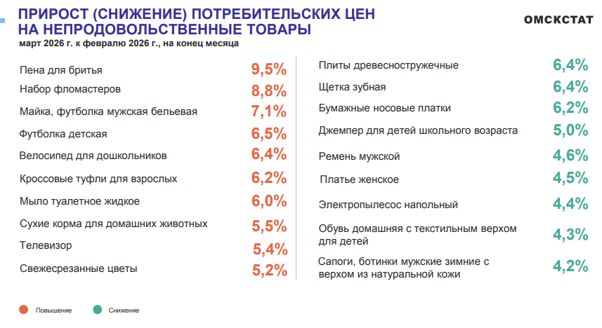 Перед сезоном подорожали велосипеды для детей и взрослых - на 6,4% и 3,5%. В марте традиционно к женском празднику поднимаются цены на свежесрезанные цветы — в этом году рост составил 5,2%. В то же время снизились цены на золотые обручальные кольца (на 2,6%). Стоимость электропылесосов уменьшилась на 4,4%. С окончанием зимы стали дешевле меха и меховые изделия — в среднем на 1,9%.