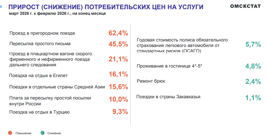 За март в Омской области существенно увеличился проезд в электричках — сразу на 62,4%. Билеты на поезд в плацкартном вагоне тоже подорожали — на 21,1%.