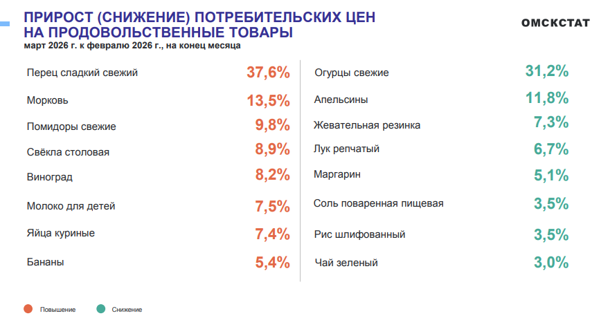 Омскстат рассказал, как изменились цены в Омской области к концу марта. Продукты в целом подорожали незначительно – на 0,2%. В лидерах роста оказался свежий перец, стоимость которого за первый весенний месяц взлетела на 37,6%. Морковь стала дороже на 13,5%, помидоры - на 9,8%, свекла - на 8,9%. Существенно подешевели огурцы — на 31,2%. Снизились цена на апельсины (-11,8%) и репчатый лук (-6,7%).