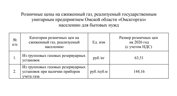 «Установить и ввести в действие розничные цены на сжиженный газ, реализуемый государственным унитарным предприятием Омской области «Омскгоргаз» населению для бытовых нужд, согласно приложению к настоящему приказу», - говорится в документе.