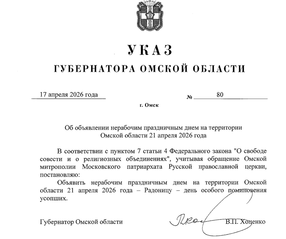 В пятницу омский губернатор заявил, что объявляет 21 апреля (православные в этот день поминают усопших) выходным оплачиваемым днем. Это решение он объяснил следующим образом: «Получаю много обращений от жителей Омской области по поводу Радоницы. И Омская Епархия также поддерживает, чтобы мы Радоницу сделали в этом году выходным днем».