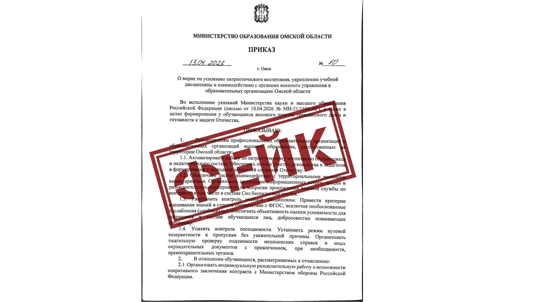 По вузам Омска через электронную почту рассылается «документ» от имени регионального минобразования. Приказ называется «О мерах по усилению патриотического воспитания, укреплению учебной дисциплины и взаимодействию с органами военного управления в образовательных организациях Омской области». В нем сообщается, что руководители учебных заведений должны «активизировать работу по патриотическому воспитанию», организовать разъяснения «по вопросам прохождения военной службы по контракту, в том числе в составе Сил беспилотных систем».