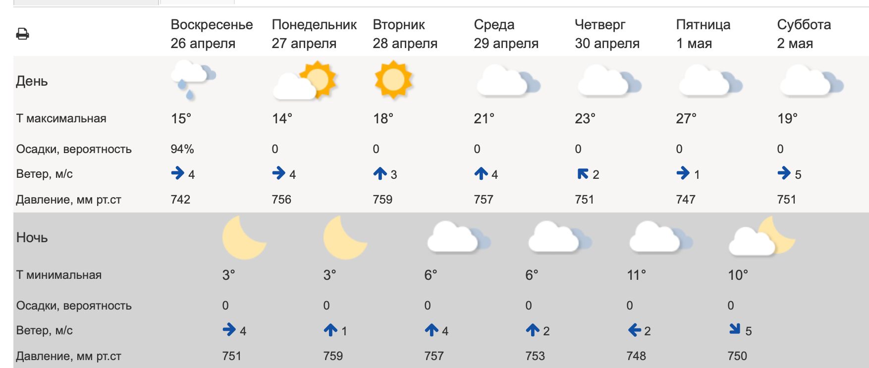 Так, к пятнице, 1 мая, ожидается, что воздух прогреется до +27 градусов днем. В ночные часы при этом будет до +11. Осадки в этот день маловероятны.