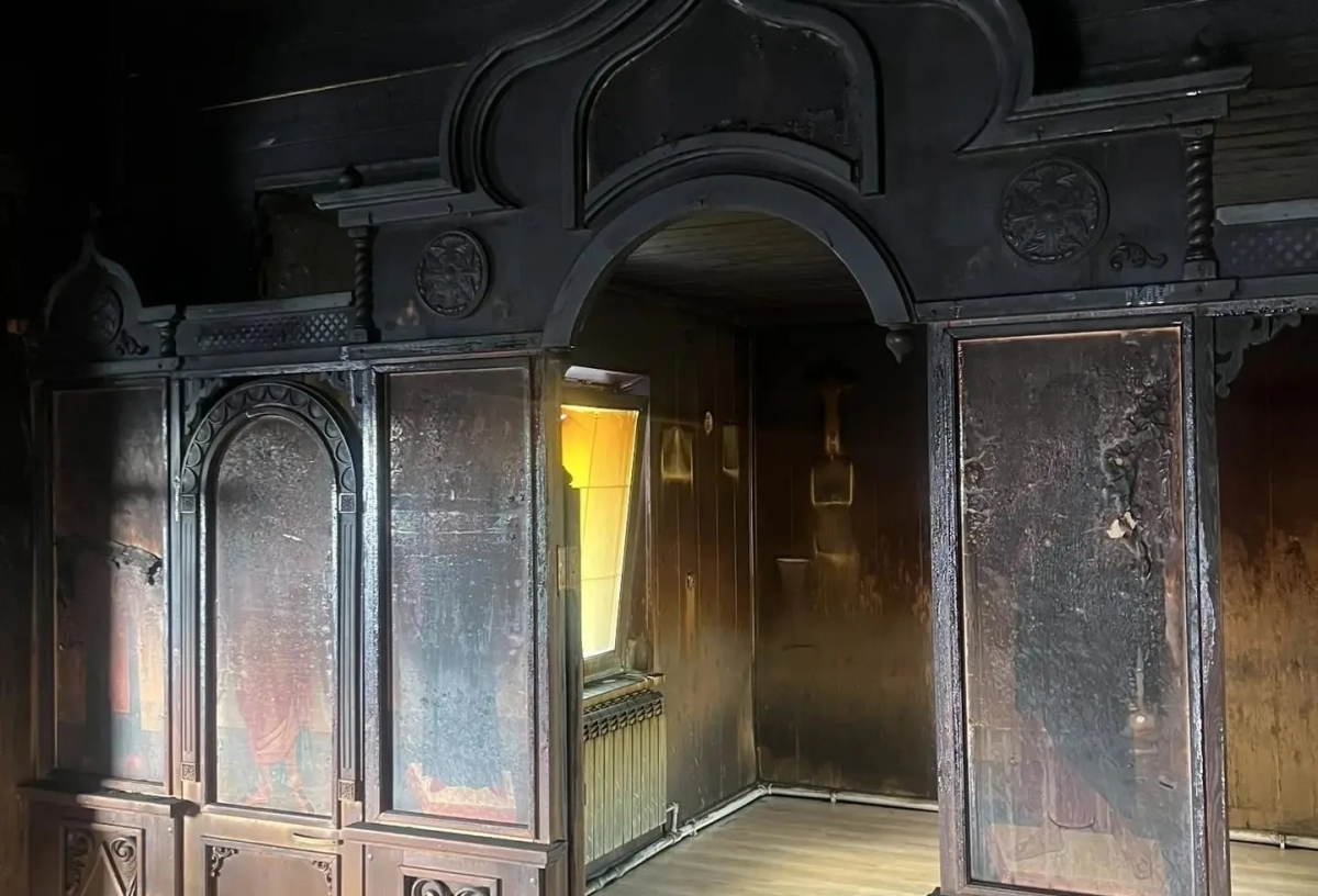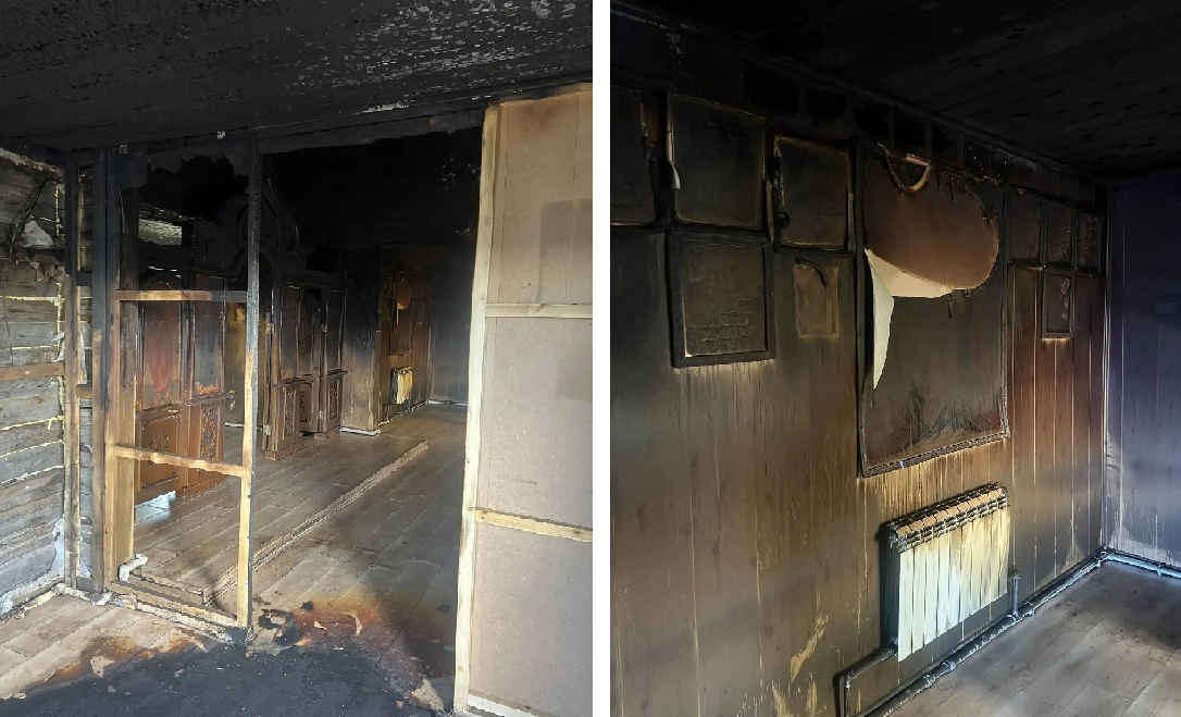На фотографиях с места пожара видно, что стены и двери в храме обгорели и закопчены, повреждены некоторые иконы.